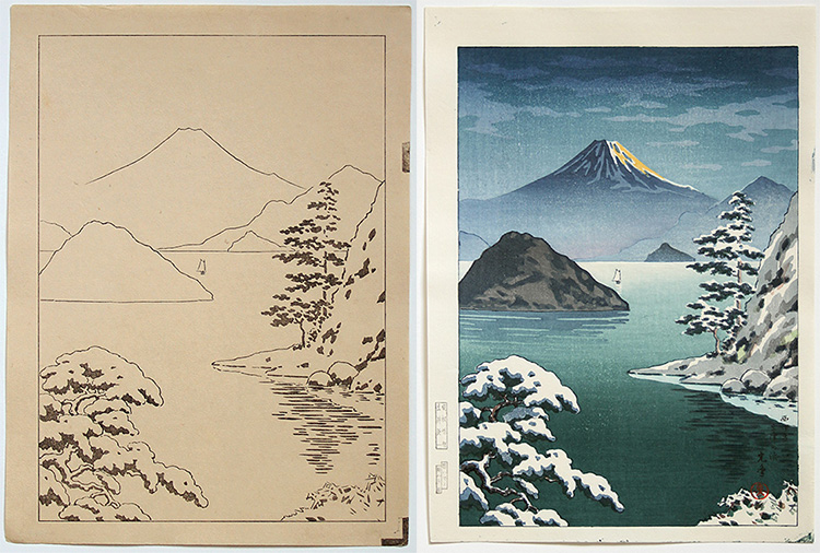 Original Japanese Woodblock Print, Size: both Chuban (keyblock: 28,6 x 21,2 cm, color print: 28,6 x 20,4 cm)