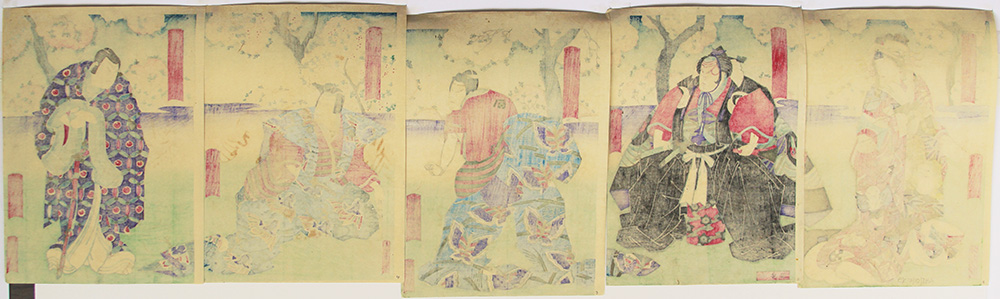 Pentaptychon depicting actors as five figures from the drama about the Soga brothers: (from the right) Kudô Saemon Suketsune, Soga no Jûrô, Soga no Gorô, Kobayashi no Asahina, Ôiso no Tora