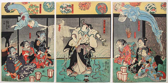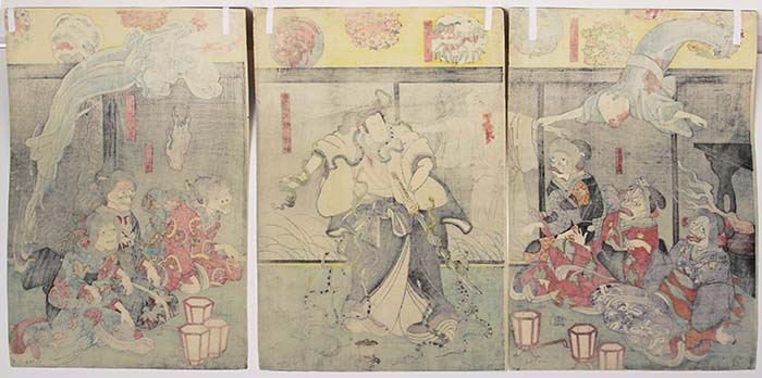 Bandô Hikosaburô IV as Lord Orikoshi Masatomo (center) and Ichikawa Kodanji IV as the ghost of Asakura Tôgo (on all three sheets)