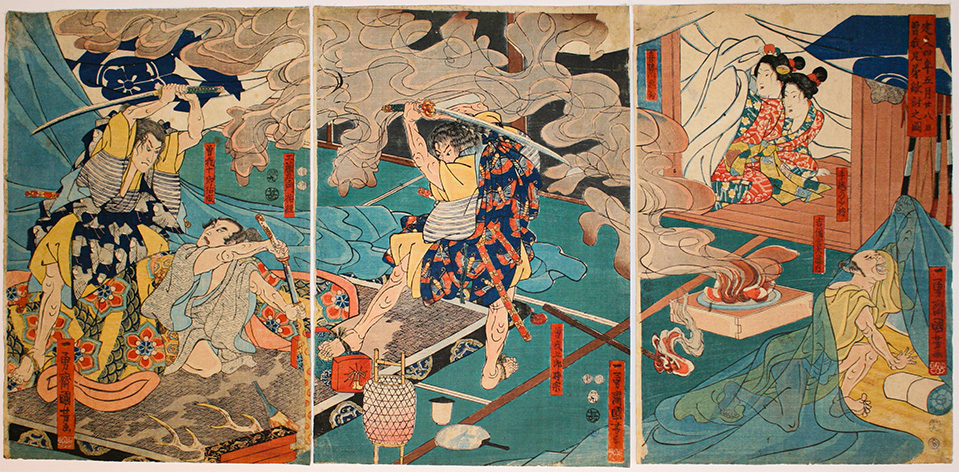The Soga brothers are about to strike down Kudô Suketsune in his tent by a smoking brazier on June 28, 1193
