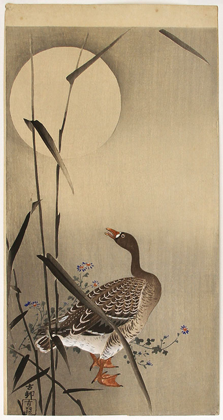 White-fronted goose and reeds, a full moon above
