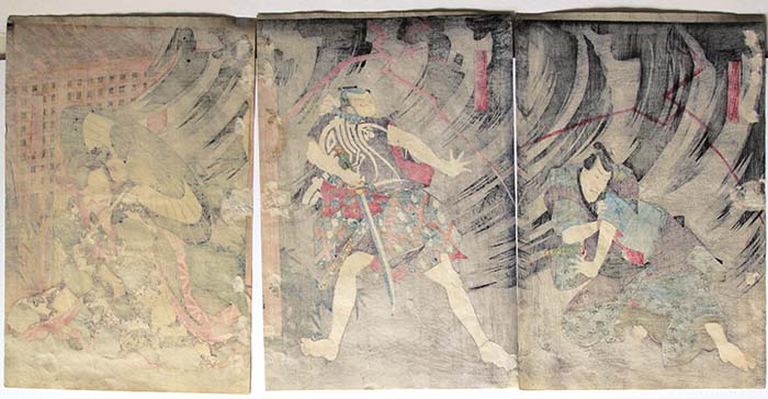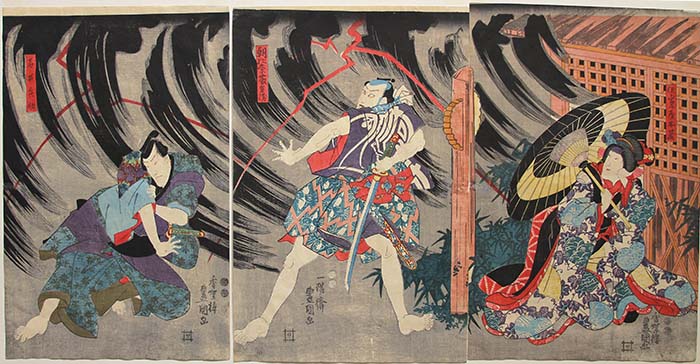 Signature: Kochoro (left and right sheet) /Ichiyosai (center sheet) Toyokuni ga