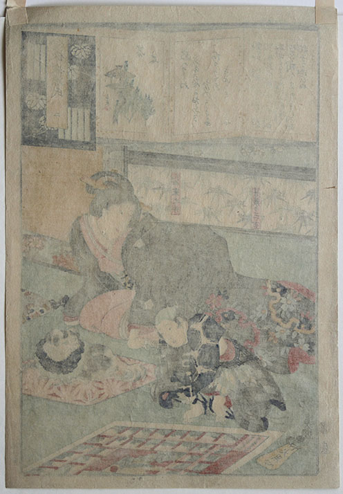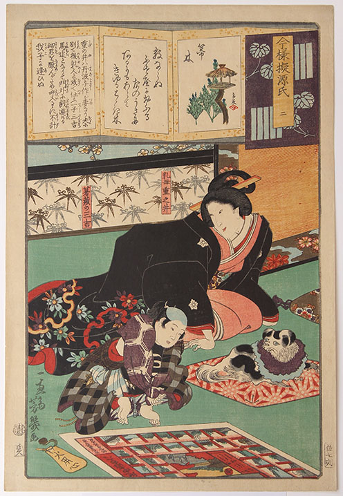 A young mother with a Dog watches her Son play Sugoroku